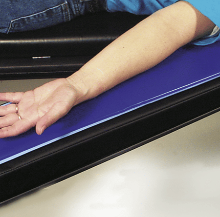 The Easy-Pivot™ Arm Board is designed for all-purpose use, including procedures in which an image intensifier is used. Other than the pivoting mechanism (the 5 inches most proximal to the table) the armboard is constructed of all radiolucent materials so that no metal parts should interfere with x-rays. The armboard is very lightweight and easy to handle. The Easy-Pivot™ is designed to pivot easily with one hand operation and hold its position. There are no gears or teeth to break. The Easy-Pivot™ utilizes a simple, adjustable resistance pivot mechanism with no fragile parts to break down. A two-inch thick conductive upholstered pad comes standard with the armboard.