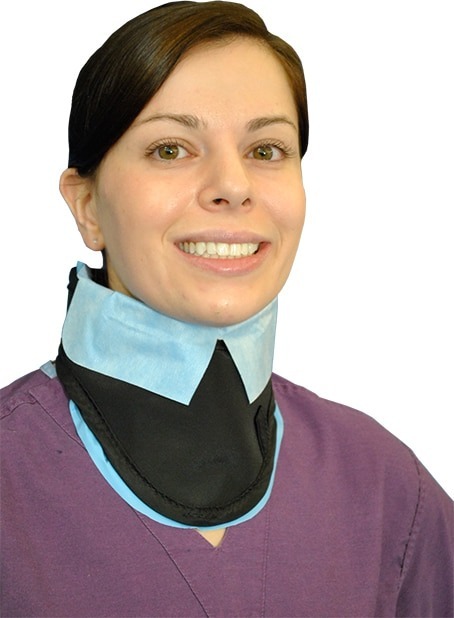 Your Thyroid Shield is the most difficult item to keep dry and clean. Because it comes in direct contact with your skin, perspiration can cause chaffing, rashes, and unsanitary conditions, especially if you share your shield with others. Our Soft-&-Clean™ Disposable Thyroid Liners are made of a super-soft fiber material. This inexpensive “soft feel” liner adheres easily to your existing thyroid shield with two self-stick tabs, and because it is value priced, a new cover can be used after each procedure.