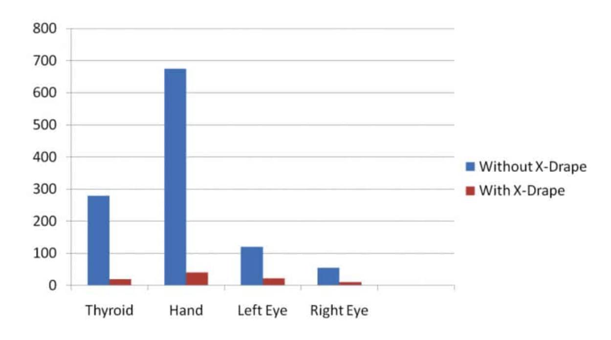 Based on 12 biopsy procedures, with and without X-Drape, the chart shows its effectiveness. Measurements in mR. Expressed in percentage of skin entrance dose. Left eye closer to radiation source.